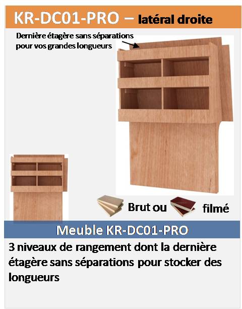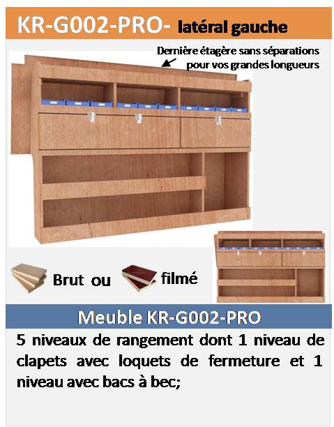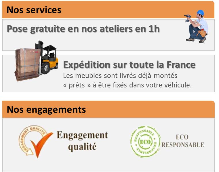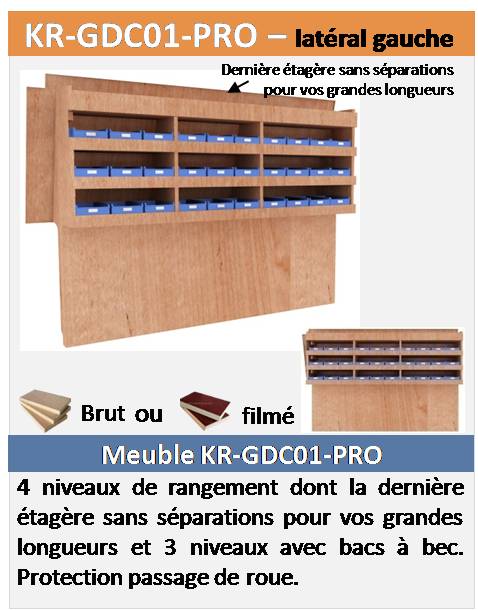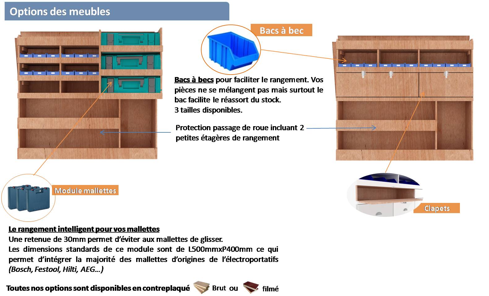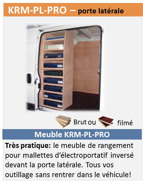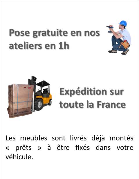 Composez votre aménagement à la carte : plusieurs configurations de meubles vous sont proposéespour votre véhicule utilitaire ainsi que les planchers et protections de portes. C’est simple :choisissez votre meuble à gauche et votre meuble à droite (ou bien une protection latérale à la place du meuble), le plancher et ensuite les protections de porte et vous obtenez l’aménagement personnalisé pour votre véhicule.
