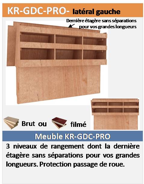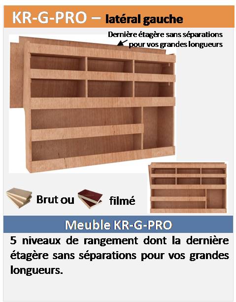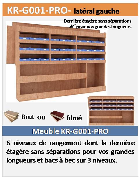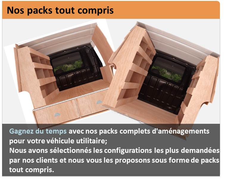 Vous souhaitez un aménagement personnalisé pour votre véhicule utilitaire de type fourgonnette L1 sans PL ? Nous vous présentons dans cette page différentes configurations de meubles standards ou spécifiques en bois Gamme Pro. En sachant que nous sommes fabricants, pouvez nous demander des modifications dans ces meubles comme une profondeur supérieur ou inférieur, moins ou plus d’étagères, des options supplémentaires… Avez-vous visité notre page des « PACKS tout compris »? On vous propose 7 packs standards complets avec plancher….