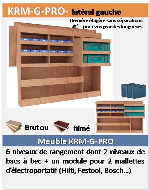 Par exemple, un plombier aura besoin de beaucoup de stockage pour ranger ses différentes pièces, de petites et grandes cases pour les raccords. Les étagères des meubles bois devront être solides car les raccords de plomberie peuvent être très lourds. Il est nécessaire d’avoir aussi un espace pour ranger les grandes longueurs de tubes, la dernière étagère de nos meubles bois est sans séparations pour y ranger ces tubes. Un espace dérangement pour les mallettes d’électroportatif est prévu dans le meuble KRM de notre gamme pro. Généralement, le plombier utilise un poste à souder sur chariot, nous fixons 2 anneaux sur la cloison derrière le siège passager afin qu’il le sangle à cette place. Cet configuration d’aménagement peut aussi convenir à un chauffagiste, un frigoriste ou un électricien.