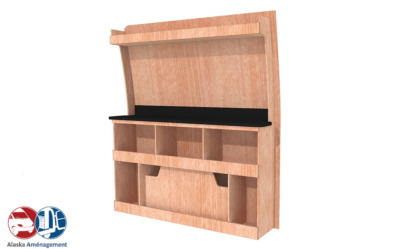 Cet établi robuste ETAD104-N (pour le latéral « droite » de votre véhicule) avec plan de travail renforcé et casiers de rangement, est conçu pour les artisans exigeants. Le fond arrière intégré (8 mm) protège efficacement la carrosserie et renforce la rigidité. Ce meuble est disponible en contreplaqué brut ou filmé.