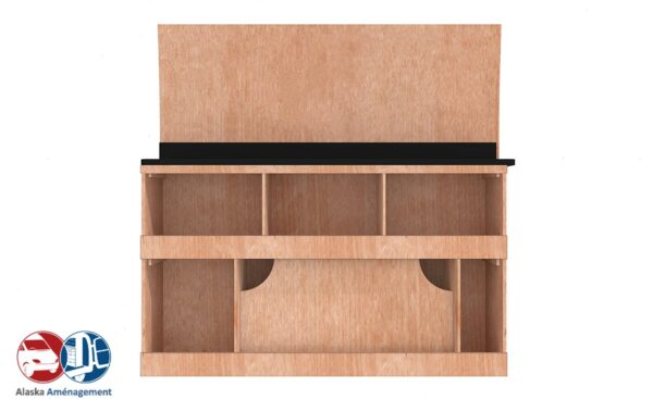 Cet établi robuste ETAD104-N (pour le latéral « droite » de votre véhicule) avec plan de travail renforcé et casiers de rangement, est conçu pour les artisans exigeants. Le fond arrière intégré (8 mm) protège efficacement la carrosserie et renforce la rigidité. Ce meuble est disponible en contreplaqué brut ou filmé.