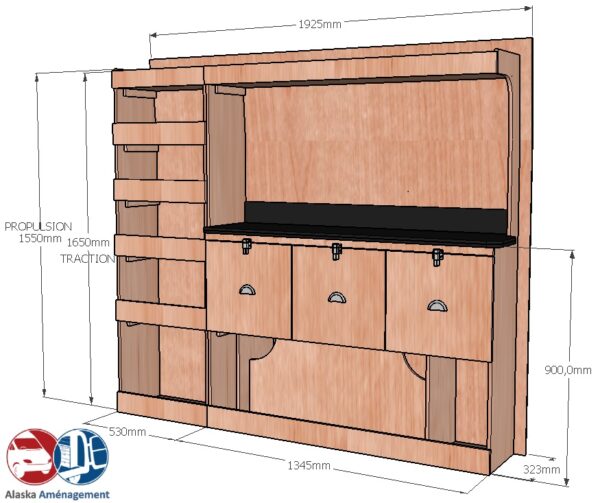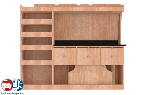 Structure Renforcée et Protectrice : Le meuble intègre un fond arrière de 8 mm qui renforce sa structure et le solidarise. Un avantage économique direct pour vous : il protège efficacement la carrosserie de votre fourgon, vous dispensant d’installer un habillage latéral supplémentaire !