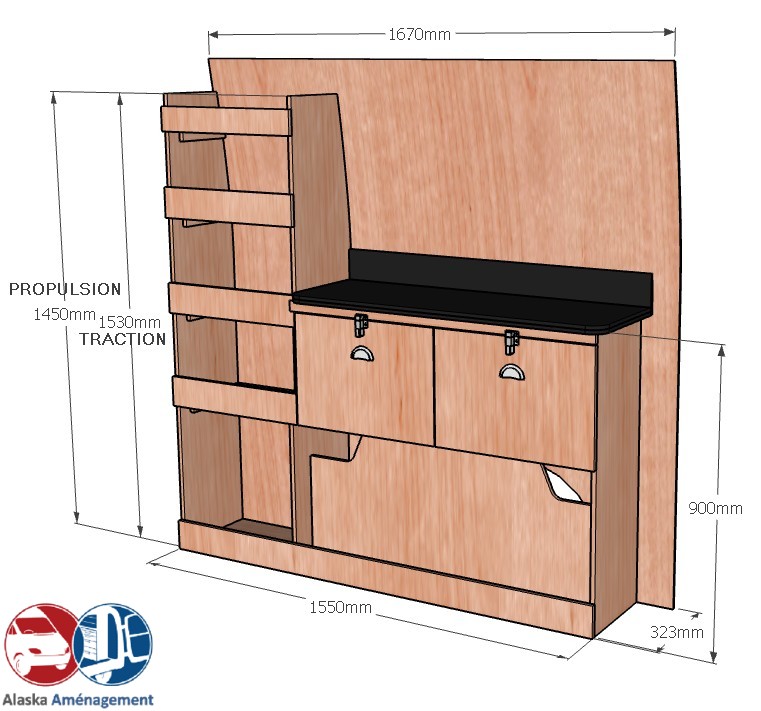 • Structure Renforcée et Protectrice : Le meuble intègre un fond arrière de 8 mm qui renforce sa structure et le solidarise. Un avantage économique direct pour vous : il protège efficacement la carrosserie de votre fourgon, vous dispensant d’installer un habillage latéral supplémentaire !