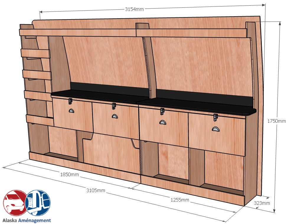 Cet établi robuste ETAD106-N (pour le latéral « droite » de votre véhicule) avec plan de travail renforcé, tiroirs robustes et une colonne de rangement est conçu pour les artisans exigeants. Le fond arrière intégré (8 mm) protège efficacement la carrosserie et renforce la rigidité. Ce meuble est disponible en contreplaqué brut ou filmé. |