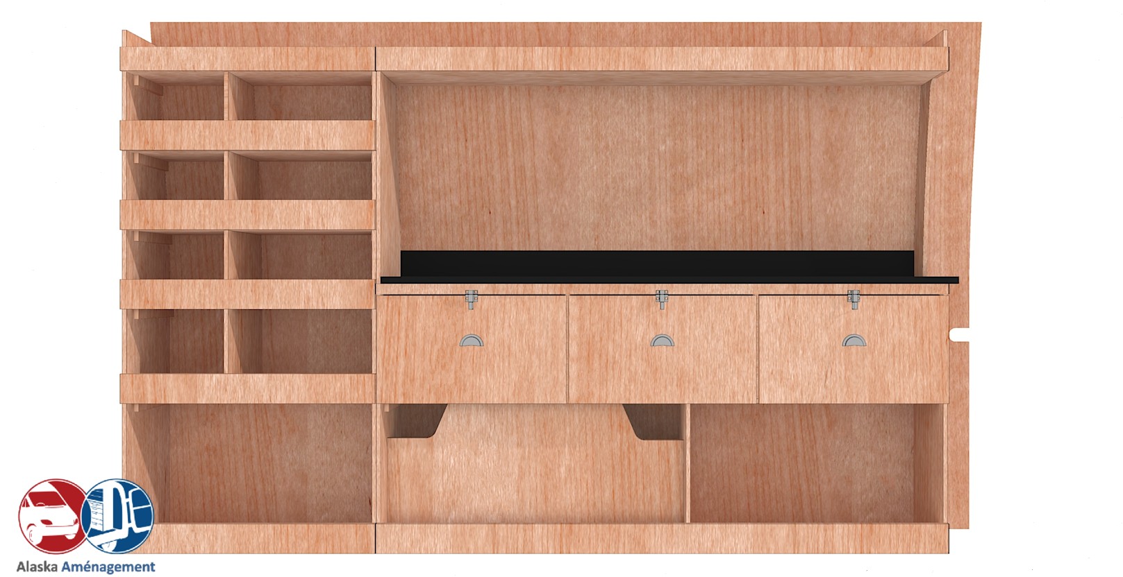 • Structure Renforcée et Protectrice : Le meuble intègre un fond arrière de 8 mm qui renforce sa structure et le solidarise. Un avantage économique direct pour vous : il protège efficacement la carrosserie de votre fourgon, vous dispensant d’installer un habillage latéral supplémentaire !