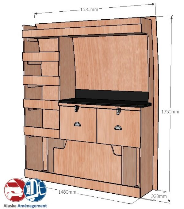 Structure Renforcée et Protectrice : Le meuble intègre un fond arrière de 8 mm qui renforce sa structure et le solidarise. Un avantage économique direct pour vous : il protège efficacement la carrosserie de votre fourgon, vous dispensant d’installer un habillage latéral supplémentaire !
