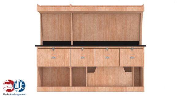 • Structure Renforcée et Protectrice : Le meuble intègre un fond arrière de 8 mm qui renforce sa structure et le solidarise. Un avantage économique direct pour vous : il protège efficacement la carrosserie de votre fourgon, vous dispensant d’installer un habillage latéral supplémentaire !