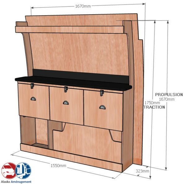 • Structure Renforcée et Protectrice : Le meuble intègre un fond arrière de 8 mm qui renforce sa structure et le solidarise. Un avantage économique direct pour vous : il protège efficacement la carrosserie de votre fourgon, vous dispensant d’installer un habillage latéral supplémentaire !