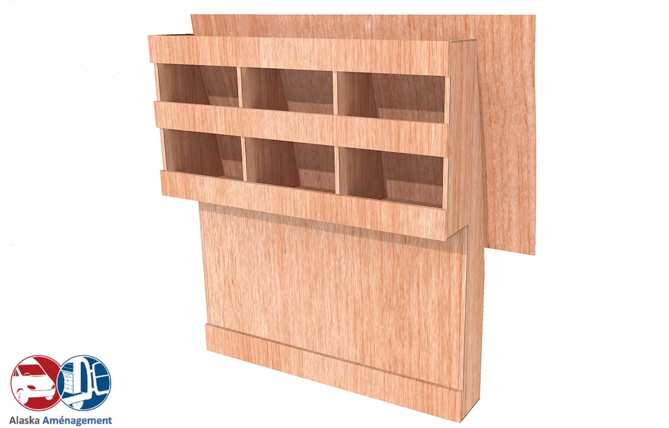Ce meuble de rangement KRD-DC-N (pour le latéral « Droite » de votre véhicule) offre une solution de stockage polyvalente et fonctionnelle avec trois niveaux de stockage. Il comprend des étagères pour stocker divers équipements et matériels. Une étagère supérieure est conçue pour les objets longs. Son fond arrière intégré et sa protection de passage de roue assurent la rigidité et protège la carrosserie du véhicule, évitant un habillage supplémentaire. Le meuble est disponible en contreplaqué brut ou filmé.