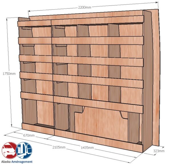 Ce meuble de rangement KRD-N (pour le latéral « Droite » de votre véhicule) offre une solution de stockage polyvalente et fonctionnelle avec six niveaux de stockage. Il comprend des étagères pour stocker divers équipements et matériels. Une étagère supérieure est conçue pour les objets longs. Son fond arrière intégré assure la rigidité et protège la carrosserie du véhicule, évitant un habillage supplémentaire. Le meuble est disponible en contreplaqué brut ou filmé.
