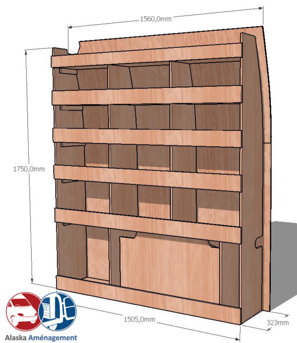 Ce meuble de rangement KRD-N(pour le latéral « Droite » de votre véhicule) offre une solution de stockage polyvalente et fonctionnelle avec six niveaux de stockage. Il comprend des étagères pour stocker divers équipements et matériels. Une étagère supérieure est conçue pour les objets longs. Son fond arrière intégré assure la rigidité et protège la carrosserie du véhicule, évitant un habillage supplémentaire. Le meuble est disponible en contreplaqué brut ou filmé.