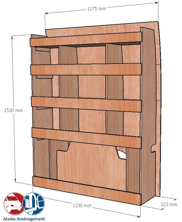 Ce meuble de rangement KRD-N (pour le latéral « Droite » de votre véhicule) offre une solution de stockage polyvalente et fonctionnelle avec cinq niveaux de stockage. Il comprend des étagères pour stocker divers équipements et matériels. Une étagère supérieure est conçue pour les objets longs. Son fond arrière intégré assure la rigidité et protège la carrosserie du véhicule, évitant un habillage supplémentaire. Le meuble est disponible en contreplaqué brut ou filmé.