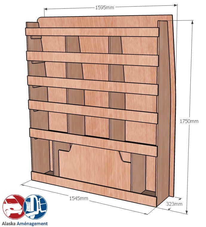 Ce meuble de rangement KRD-N (pour le latéral « Droite » de votre véhicule) offre une solution de stockage polyvalente et fonctionnelle avec six niveaux de stockage. Il comprend des étagères pour stocker divers équipements et matériels. Une étagère supérieure est conçue pour les objets longs. Son fond arrière intégré assure la rigidité et protège la carrosserie du véhicule, évitant un habillage supplémentaire. Le meuble est disponible en contreplaqué brut ou filmé. |