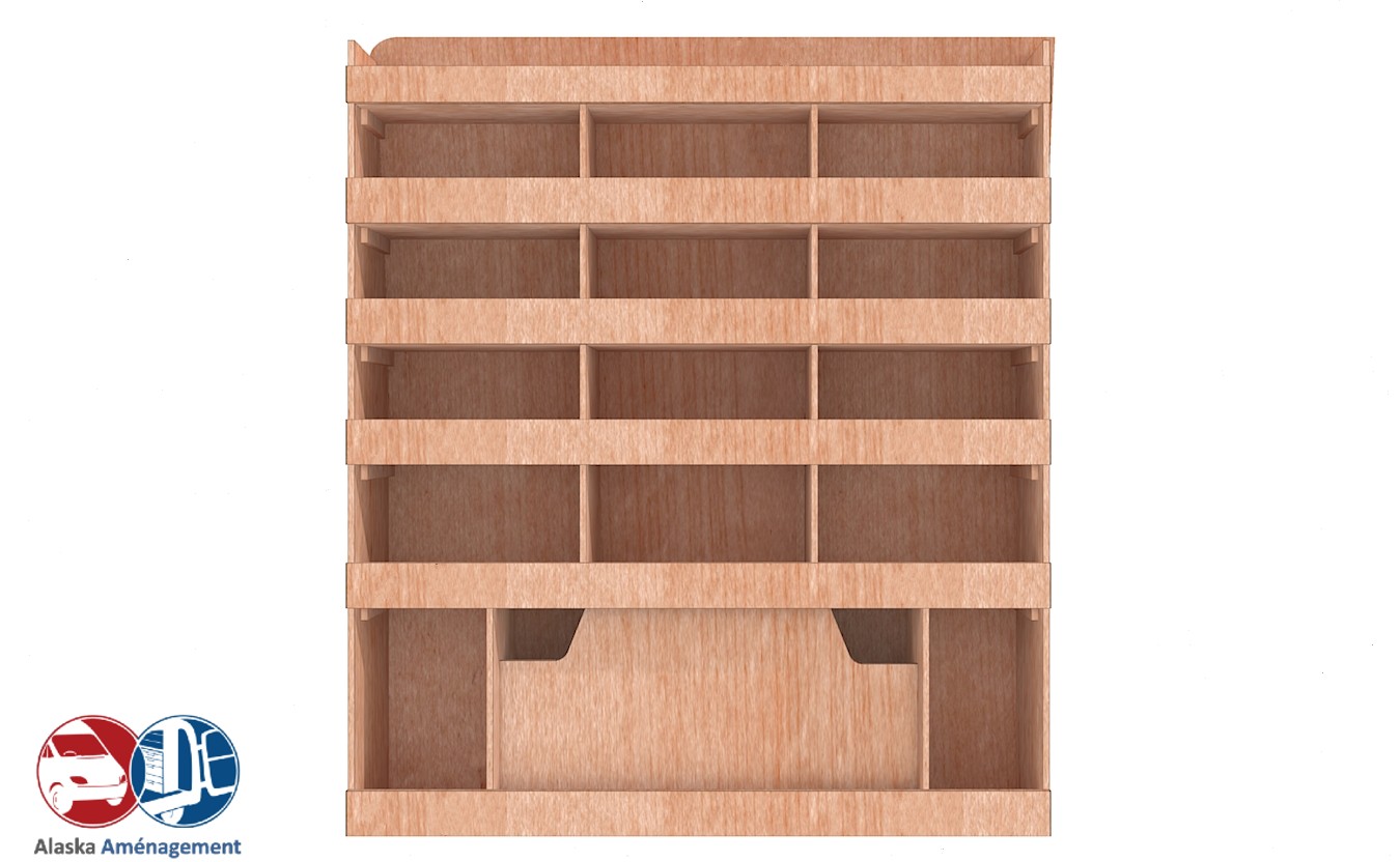 Ce meuble de rangement KRD-N (pour le latéral « Droite » de votre véhicule) offre une solution de stockage polyvalente et fonctionnelle avec six niveaux de stockage. Il comprend des étagères pour stocker divers équipements et matériels. Une étagère supérieure est conçue pour les objets longs. Son fond arrière intégré assure la rigidité et protège la carrosserie du véhicule, évitant un habillage supplémentaire. Le meuble est disponible en contreplaqué brut ou filmé.