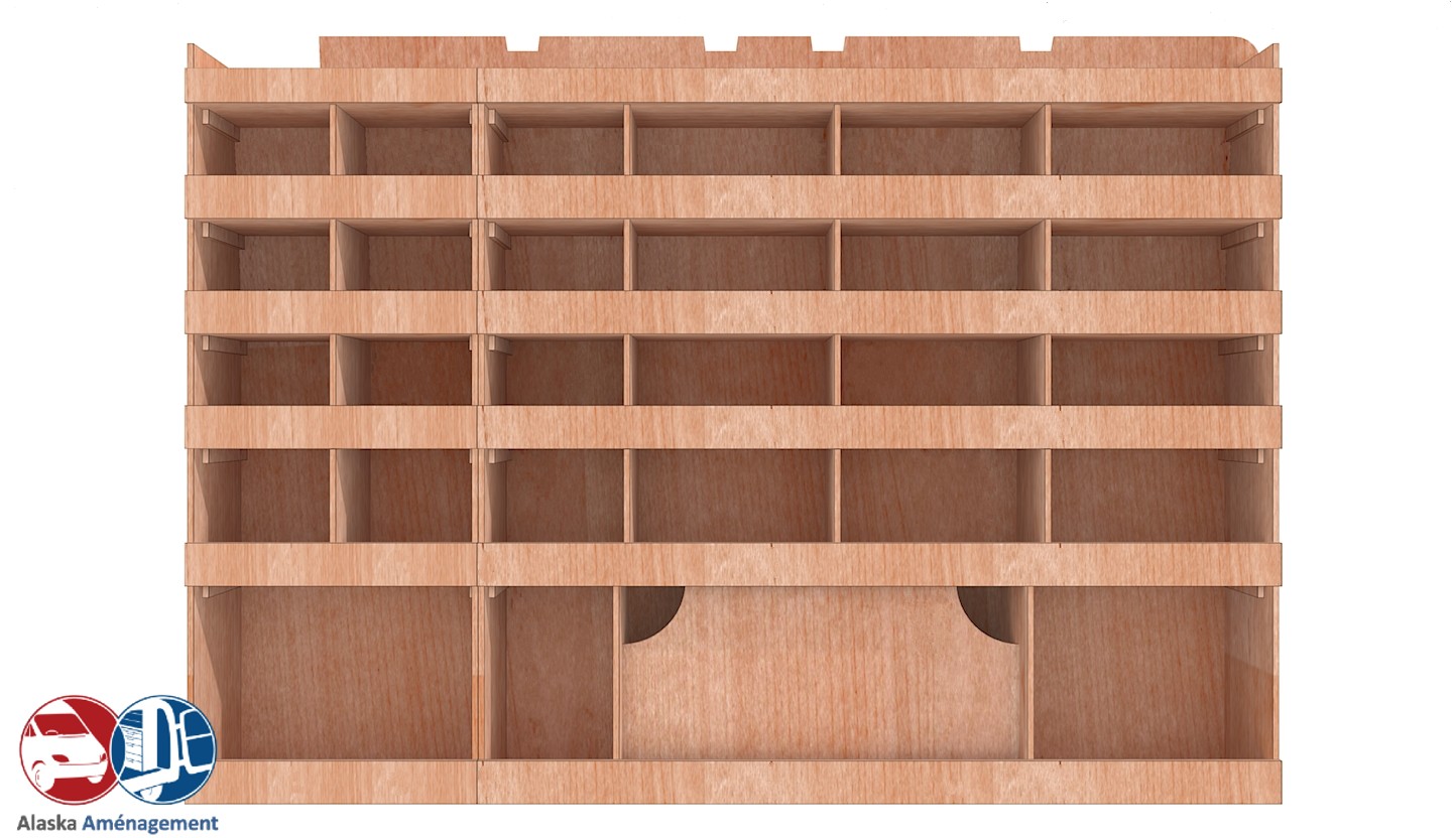Ce meuble de rangement KRD-N (pour le latéral « Droite » de votre véhicule) offre une solution de stockage polyvalente et fonctionnelle avec six niveaux de stockage. Il comprend des étagères pour stocker divers équipements et matériels. Une étagère supérieure est conçue pour les objets longs. Son fond arrière intégré assure la rigidité et protège la carrosserie du véhicule, évitant un habillage supplémentaire. Le meuble est disponible en contreplaqué brut ou filmé.