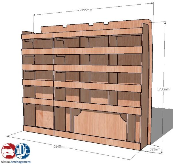 Ce meuble de rangement KRD-N(pour le latéral « Droite » de votre véhicule) offre une solution de stockage polyvalente et fonctionnelle avec six niveaux de stockage. Il comprend des étagères pour stocker divers équipements et matériels. Une étagère supérieure est conçue pour les objets longs. Son fond arrière intégré assure la rigidité et protège la carrosserie du véhicule, évitant un habillage supplémentaire. Le meuble est disponible en contreplaqué brut ou filmé.
