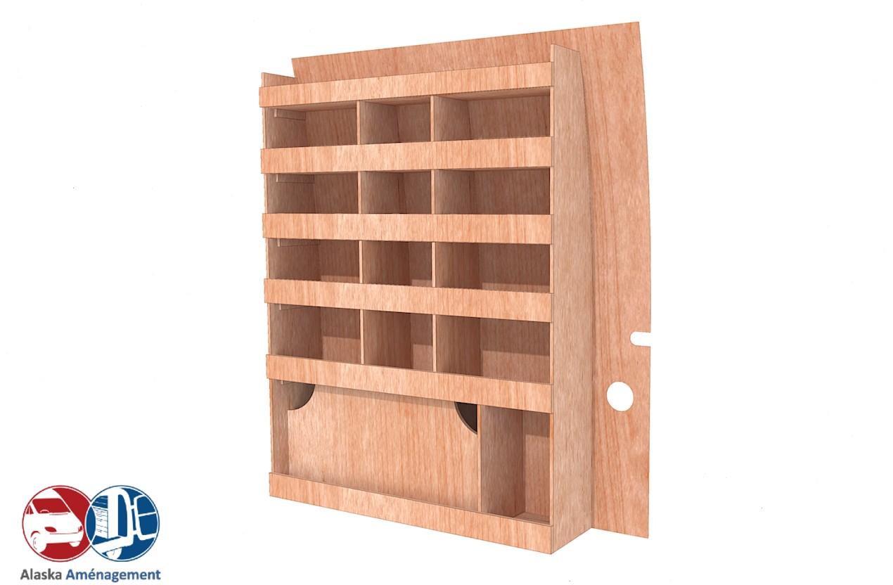 Ce meuble de rangement KRD-N (pour le latéral « Droite » de votre véhicule) offre une solution de stockage polyvalente et fonctionnelle avec six niveaux de stockage. Il comprend des étagères pour stocker divers équipements et matériels. Une étagère supérieure est conçue pour les objets longs. Son fond arrière intégré assure la rigidité et protège la carrosserie du véhicule, évitant un habillage supplémentaire. Le meuble est disponible en contreplaqué brut ou filmé.