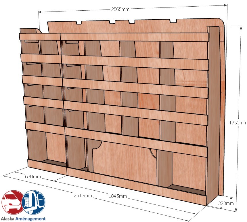 Ce meuble de rangement KRD-N (pour le latéral « Droite » de votre véhicule) offre une solution de stockage polyvalente et fonctionnelle avec six niveaux de stockage. Il comprend des étagères pour stocker divers équipements et matériels. Une étagère supérieure est conçue pour les objets longs. Son fond arrière intégré assure la rigidité et protège la carrosserie du véhicule, évitant un habillage supplémentaire. Le meuble est disponible en contreplaqué brut ou filmé. |