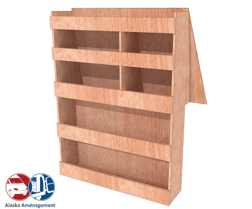 Ce meuble de rangement KRD-N (pour le latéral « Droite » de votre véhicule) offre une solution de stockage polyvalente et fonctionnelle avec cinq niveaux de stockage. Il comprend des étagères pour stocker divers équipements et matériels. Une étagère supérieure est conçue pour les objets longs. Son fond arrière intégré assure la rigidité et protège la carrosserie du véhicule, évitant un habillage supplémentaire. Le meuble est disponible en contreplaqué brut ou filmé.