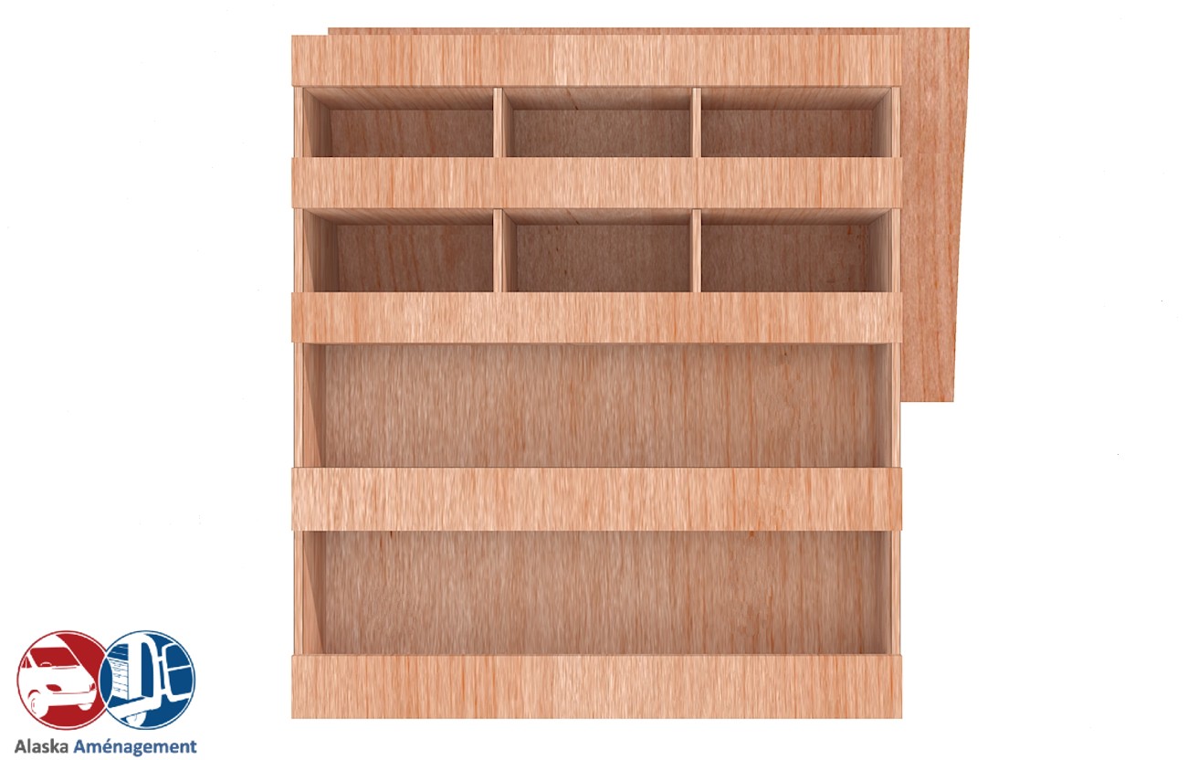 Ce meuble de rangement KRD-N (pour le latéral « Droite » de votre véhicule) offre une solution de stockage polyvalente et fonctionnelle avec cinq niveaux de stockage. Il comprend des étagères pour stocker divers équipements et matériels. Une étagère supérieure est conçue pour les objets longs. Son fond arrière intégré assure la rigidité et protège la carrosserie du véhicule, évitant un habillage supplémentaire. Le meuble est disponible en contreplaqué brut ou filmé. |