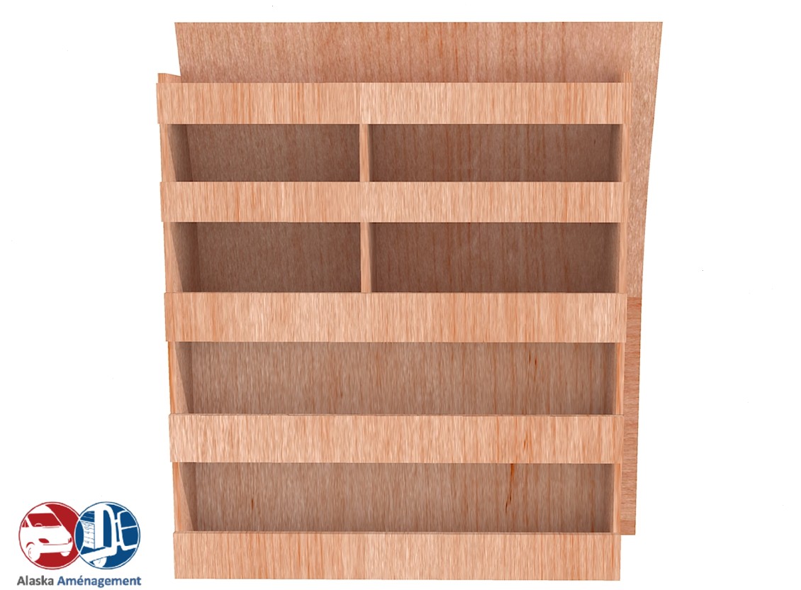 Ce meuble de rangement KRD-N (pour le latéral « Droite » de votre véhicule) offre une solution de stockage polyvalente et fonctionnelle avec cinq niveaux de stockage. Il comprend des étagères pour stocker divers équipements et matériels. Une étagère supérieure est conçue pour les objets longs. Son fond arrière intégré assure la rigidité et protège la carrosserie du véhicule, évitant un habillage supplémentaire. Le meuble est disponible en contreplaqué brut ou filmé.