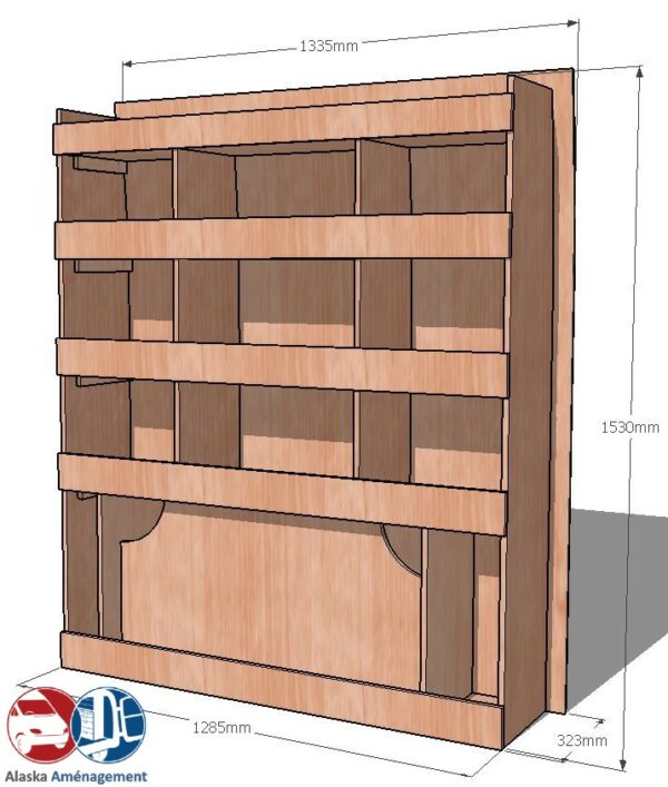 Ce meuble de rangement KRD-N(pour le latéral « Droite » de votre véhicule) offre une solution de stockage polyvalente et fonctionnelle avec cinq niveaux de stockage. Il comprend des étagères pour stocker divers équipements et matériels. Une étagère supérieure est conçue pour les objets longs. Son fond arrière intégré assure la rigidité et protège la carrosserie du véhicule, évitant un habillage supplémentaire. Le meuble est disponible en contreplaqué brut ou filmé.