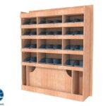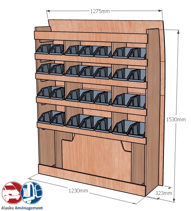 Ce meuble de rangement KRD101-N (pour le latéral « Droite » de votre véhicule) offre une solution de stockage polyvalente et fonctionnelle avec six niveaux de stockage. Il comprend des étagères pour bacs à bec pour ranger toutes vos petites pièces. Une étagère supérieure est conçue pour les objets longs. Son fond arrière intégré assure la rigidité et protège la carrosserie du véhicule, évitant un habillage supplémentaire. Le meuble est disponible en contreplaqué brut ou filmé. |