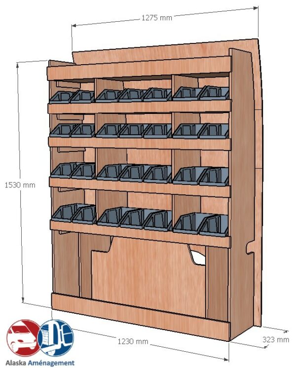 Ce meuble de rangement KRD101-N(pour le latéral « Droite » de votre véhicule) offre une solution de stockage polyvalente et fonctionnelle avec six niveaux de stockage. Il comprend des étagères pour bacs à bec pour ranger toutes vos petites pièces. Une étagère supérieure est conçue pour les objets longs. Son fond arrière intégré assure la rigidité et protège la carrosserie du véhicule, évitant un habillage supplémentaire. Le meuble est disponible en contreplaqué brut ou filmé.