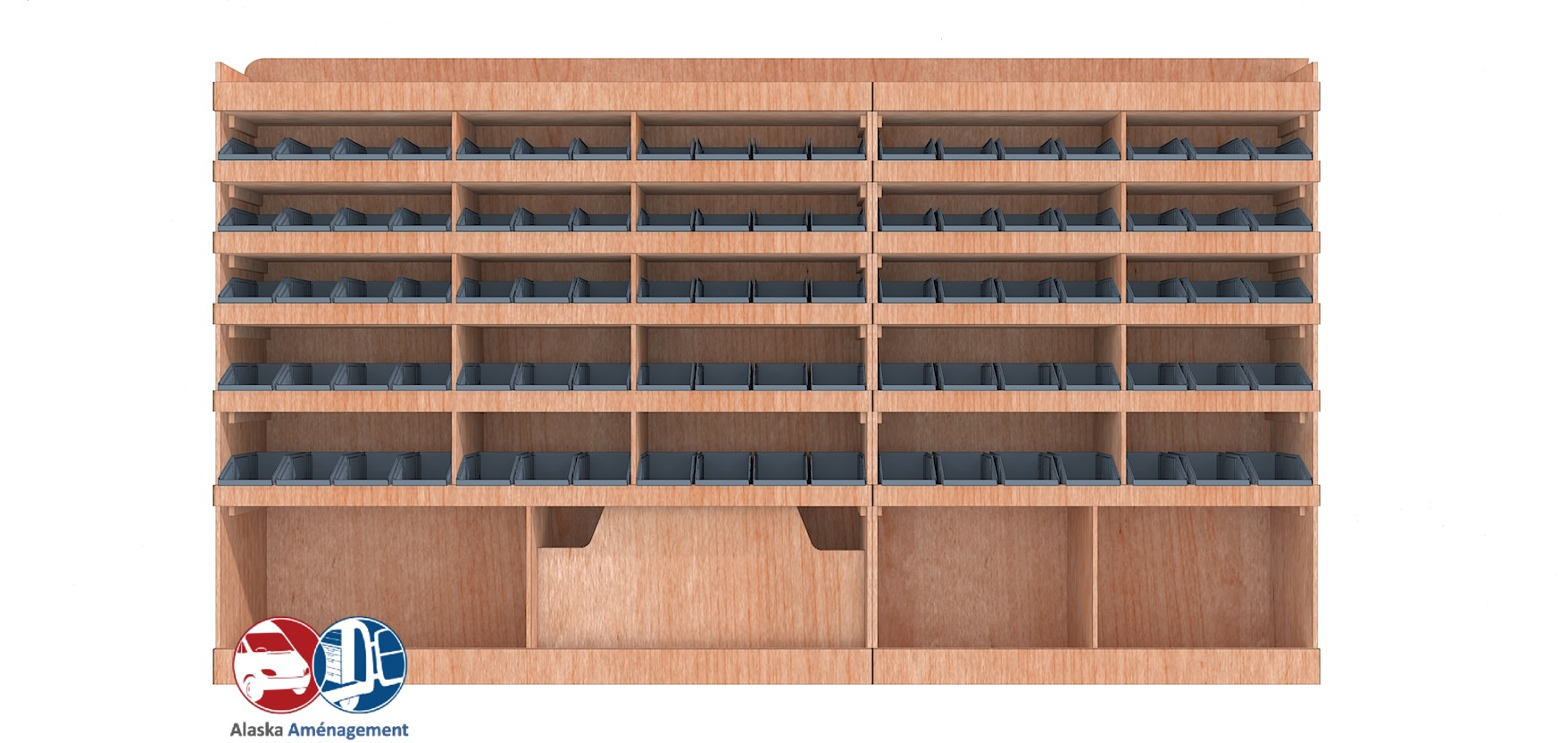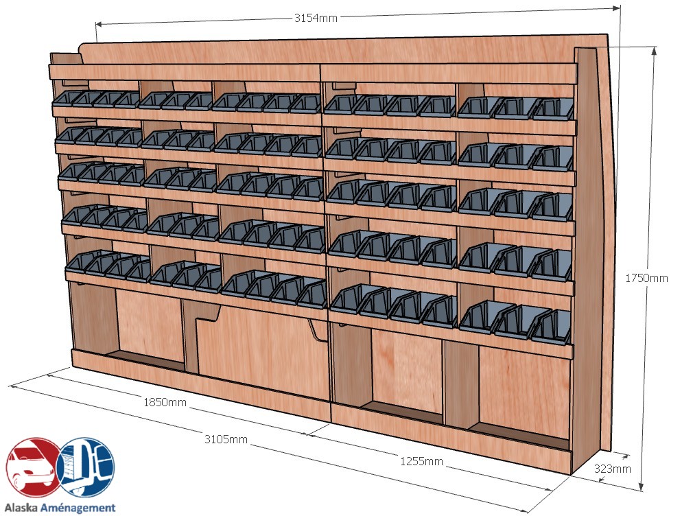 Ce meuble de rangement KRD101-N (pour le latéral « Droite » de votre véhicule) offre une solution de stockage polyvalente et fonctionnelle avec sept niveaux de stockage. Il comprend des étagères pour bacs à bec pour ranger toutes vos petites pièces. Une étagère supérieure est conçue pour les objets longs. Son fond arrière intégré assure la rigidité et protège la carrosserie du véhicule, évitant un habillage supplémentaire. Le meuble est disponible en contreplaqué brut ou filmé. |