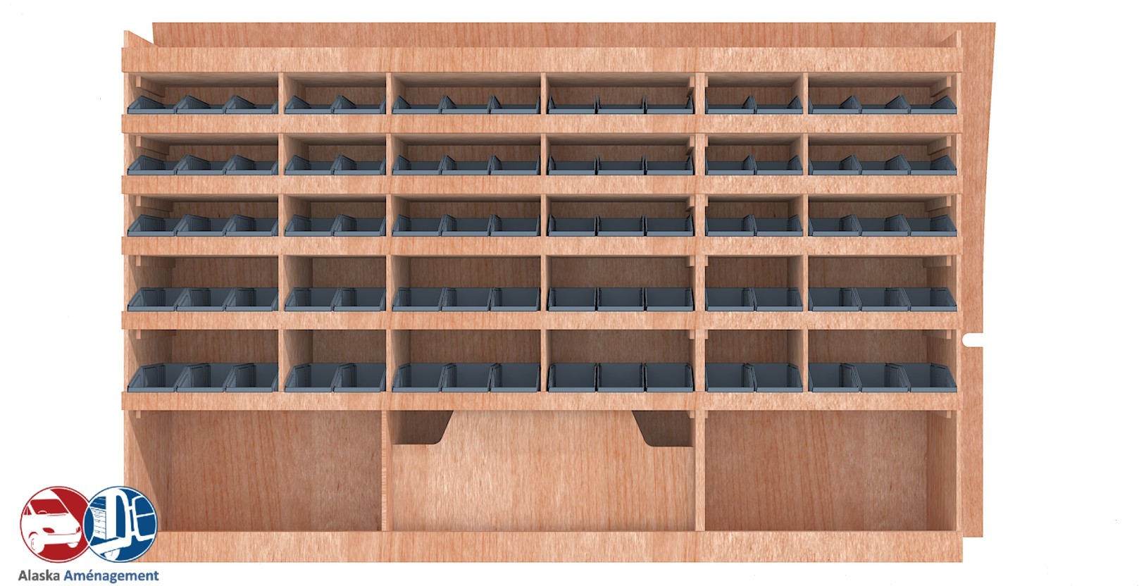 Ce meuble de rangement KRD101-N (pour le latéral « Droite » de votre véhicule) offre une solution de stockage polyvalente et fonctionnelle avec sept niveaux de stockage. Il comprend des étagères pour bacs à bec pour ranger toutes vos petites pièces. Une étagère supérieure est conçue pour les objets longs. Son fond arrière intégré assure la rigidité et protège la carrosserie du véhicule, évitant un habillage supplémentaire. Le meuble est disponible en contreplaqué brut ou filmé.