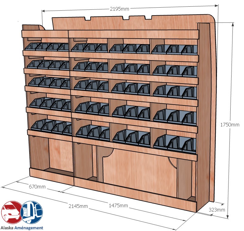 Ce meuble de rangement KRD101-N (pour le latéral « Droite » de votre véhicule) offre une solution de stockage polyvalente et fonctionnelle avec sept niveaux de stockage. Il comprend des étagères pour bacs à bec pour ranger toutes vos petites pièces. Une étagère supérieure est conçue pour les objets longs. Son fond arrière intégré assure la rigidité et protège la carrosserie du véhicule, évitant un habillage supplémentaire. Le meuble est disponible en contreplaqué brut ou filmé.