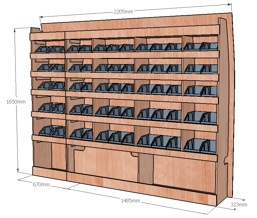 Ce meuble de rangement KRD101-N (pour le latéral « Droite » de votre véhicule) offre une solution de stockage polyvalente et fonctionnelle avec sept niveaux de stockage. Il comprend des étagères pour bacs à bec pour ranger toutes vos petites pièces. Une étagère supérieure est conçue pour les objets longs. Son fond arrière intégré assure la rigidité et protège la carrosserie du véhicule, évitant un habillage supplémentaire. Le meuble est disponible en contreplaqué brut ou filmé.