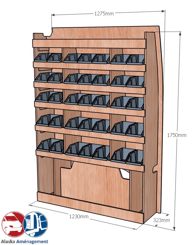 Ce meuble de rangement KRD101-N (pour le latéral « Droite » de votre véhicule) offre une solution de stockage polyvalente et fonctionnelle avec six niveaux de stockage. Il comprend des étagères pour bacs à bec pour ranger toutes vos petites pièces. Une étagère supérieure est conçue pour les objets longs. Son fond arrière intégré assure la rigidité et protège la carrosserie du véhicule, évitant un habillage supplémentaire. Le meuble est disponible en contreplaqué brut ou filmé.