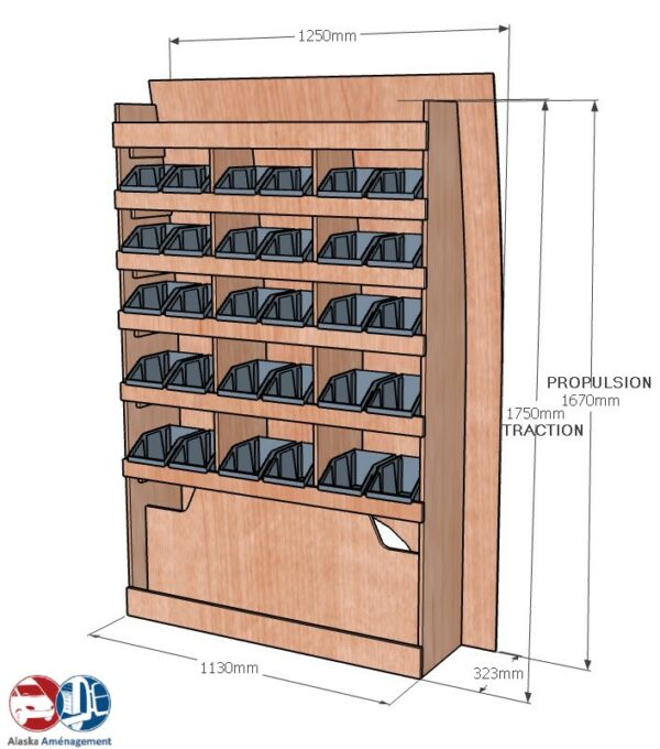 Ce meuble de rangement KRD101-N (pour le latéral « Droite » de votre véhicule) offre une solution de stockage polyvalente et fonctionnelle avec six niveaux de stockage. Il comprend des étagères pour bacs à bec pour ranger toutes vos petites pièces. Une étagère supérieure est conçue pour les objets longs. Son fond arrière intégré assure la rigidité et protège la carrosserie du véhicule, évitant un habillage supplémentaire. Le meuble est disponible en contreplaqué brut ou filmé.