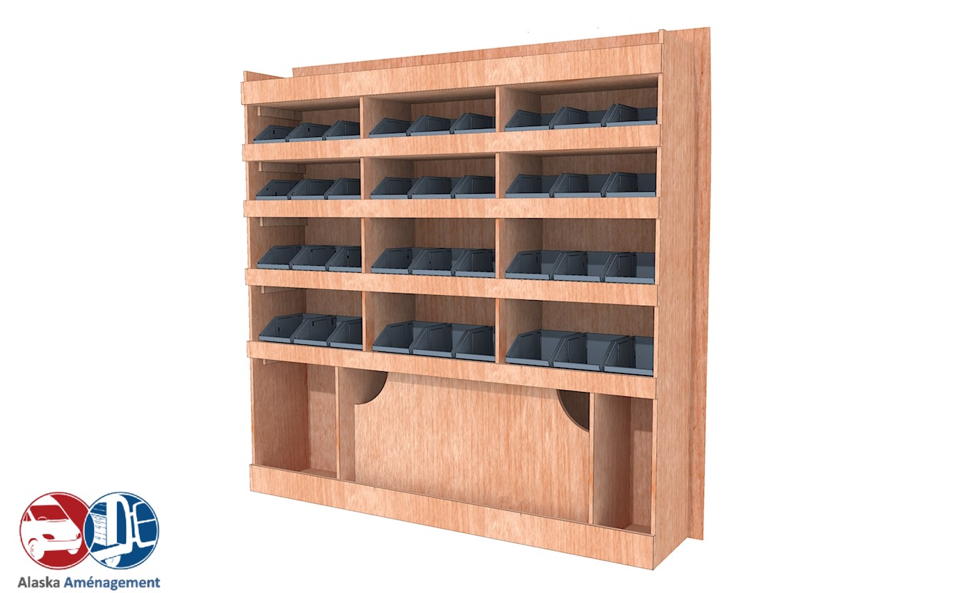 Ce meuble de rangement KRD101-N (pour le latéral « Droite » de votre véhicule) offre une solution de stockage polyvalente et fonctionnelle avec six niveaux de stockage. Il comprend des étagères pour bacs à bec pour ranger toutes vos petites pièces. Une étagère supérieure est conçue pour les objets longs. Son fond arrière intégré assure la rigidité et protège la carrosserie du véhicule, évitant un habillage supplémentaire. Le meuble est disponible en contreplaqué brut ou filmé. |