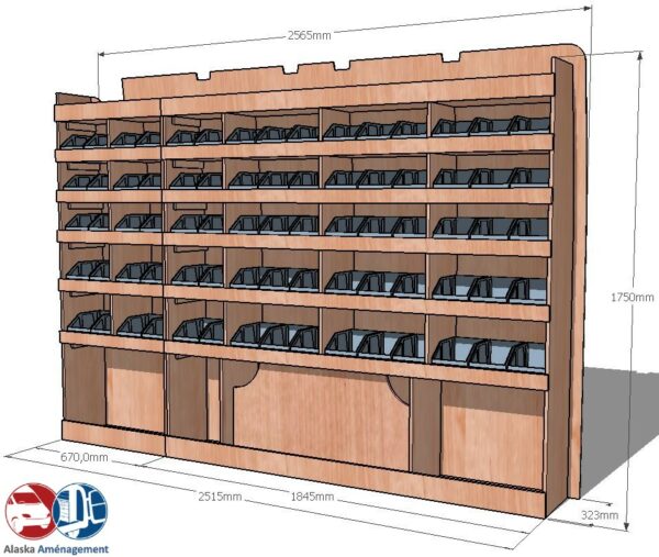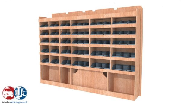 Ce meuble de rangement KRD101-N (pour le latéral « Droite » de votre véhicule) offre une solution de stockage polyvalente et fonctionnelle avec sept niveaux de stockage. Il comprend des étagères pour bacs à bec pour ranger toutes vos petites pièces. Une étagère supérieure est conçue pour les objets longs. Son fond arrière intégré assure la rigidité et protège la carrosserie du véhicule, évitant un habillage supplémentaire. Le meuble est disponible en contreplaqué brut ou filmé.