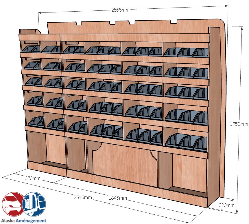 Ce meuble de rangement KRD101-N (pour le latéral « Droite » de votre véhicule) offre une solution de stockage polyvalente et fonctionnelle avec sept niveaux de stockage. Il comprend des étagères pour bacs à bec pour ranger toutes vos petites pièces. Une étagère supérieure est conçue pour les objets longs. Son fond arrière intégré assure la rigidité et protège la carrosserie du véhicule, évitant un habillage supplémentaire. Le meuble est disponible en contreplaqué brut ou filmé. |