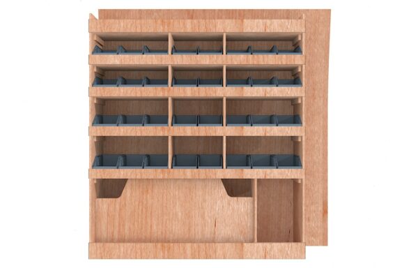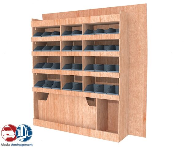 Ce meuble de rangement KRD101-N (pour le latéral « Droite » de votre véhicule) offre une solution de stockage polyvalente et fonctionnelle avec six niveaux de stockage. Il comprend des étagères pour bacs à bec pour ranger toutes vos petites pièces. Une étagère supérieure est conçue pour les objets longs. Son fond arrière intégré assure la rigidité et protège la carrosserie du véhicule, évitant un habillage supplémentaire. Le meuble est disponible en contreplaqué brut ou filmé. |