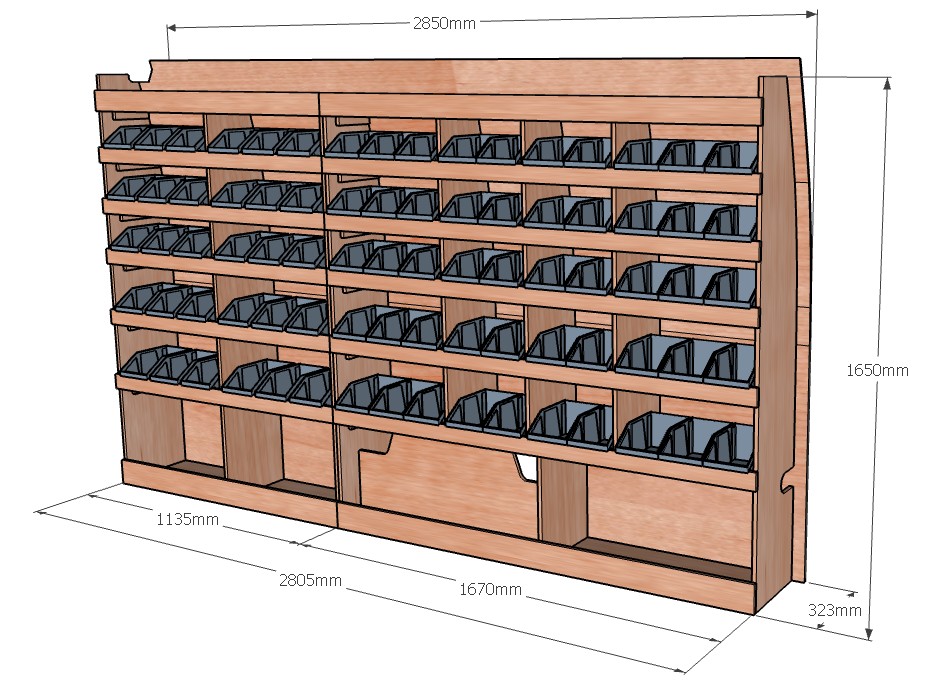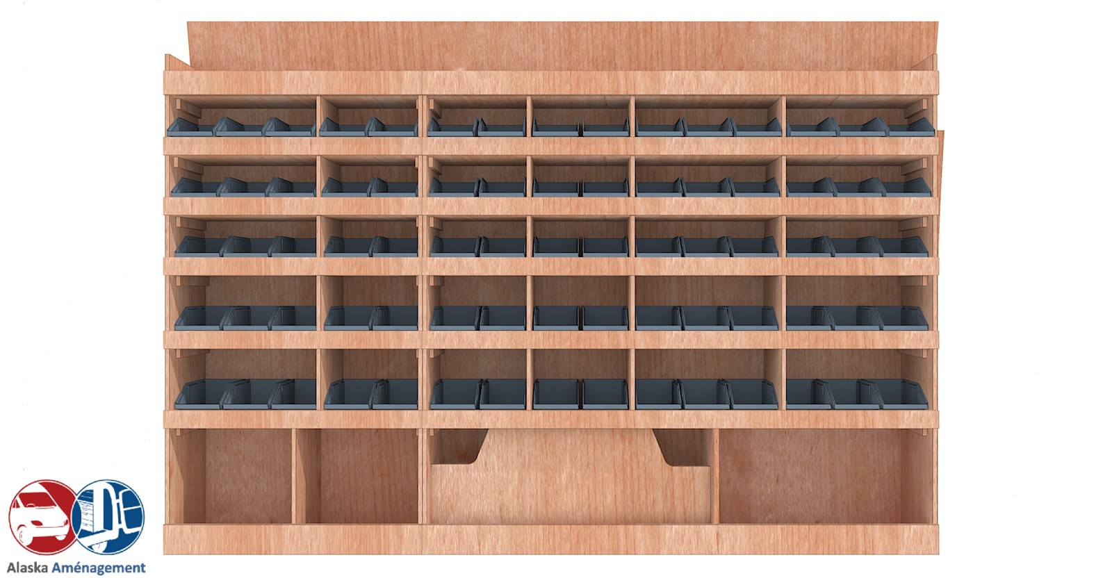 Ce meuble de rangement KRD101-N (pour le latéral « Droite » de votre véhicule) offre une solution de stockage polyvalente et fonctionnelle avec sept niveaux de stockage. Il comprend des étagères pour bacs à bec pour ranger toutes vos petites pièces. Une étagère supérieure est conçue pour les objets longs. Son fond arrière intégré assure la rigidité et protège la carrosserie du véhicule, évitant un habillage supplémentaire. Le meuble est disponible en contreplaqué brut ou filmé.
