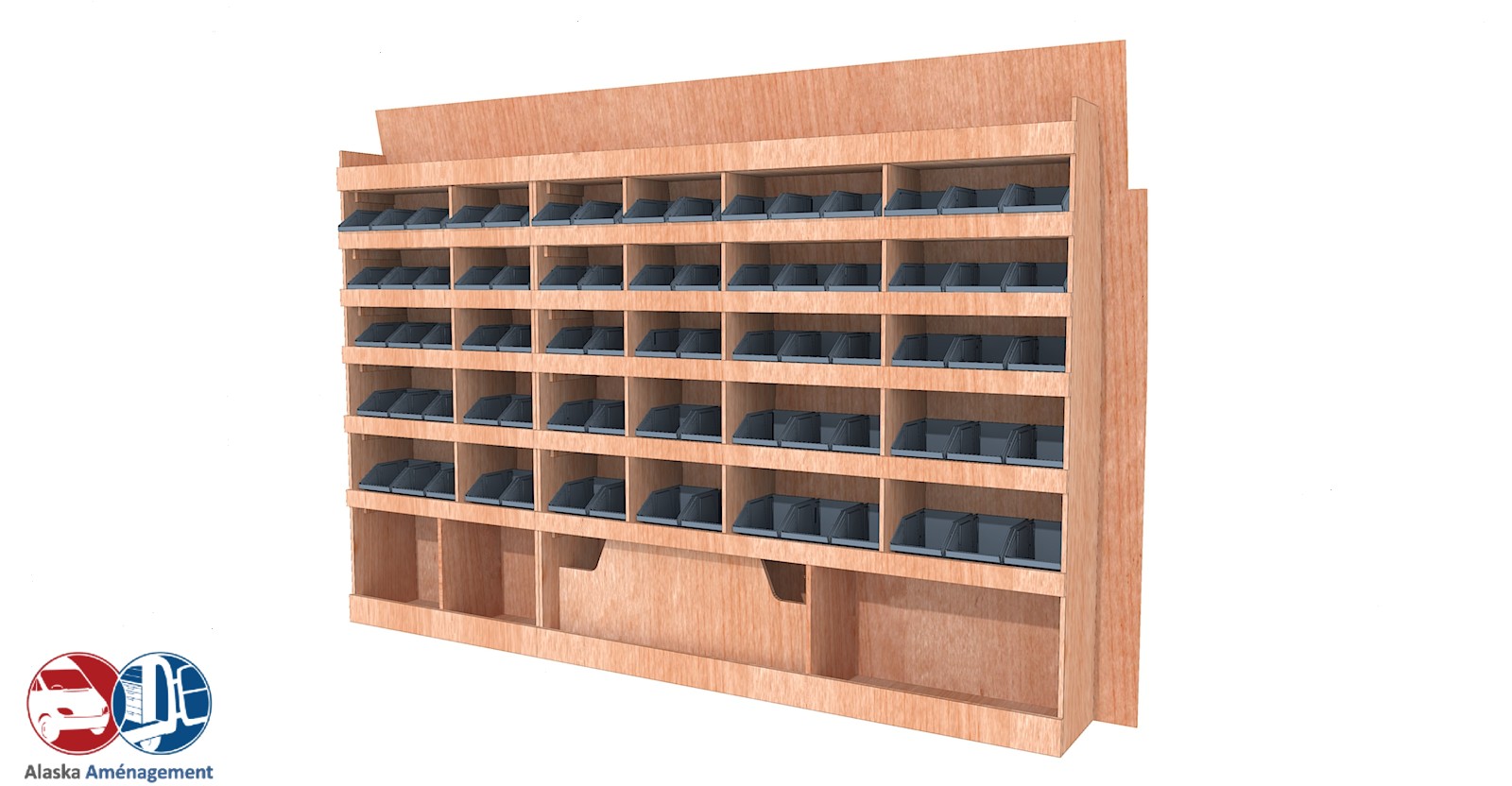 Ce meuble de rangement KRD101-N (pour le latéral « Droite » de votre véhicule) offre une solution de stockage polyvalente et fonctionnelle avec sept niveaux de stockage. Il comprend des étagères pour bacs à bec pour ranger toutes vos petites pièces. Une étagère supérieure est conçue pour les objets longs. Son fond arrière intégré assure la rigidité et protège la carrosserie du véhicule, évitant un habillage supplémentaire. Le meuble est disponible en contreplaqué brut ou filmé.