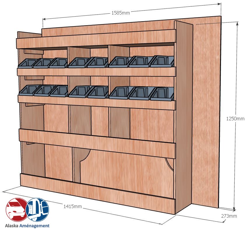 Ce meuble de rangement KRD101-N (pour le latéral « Droite » de votre véhicule) offre une solution de stockage polyvalente et fonctionnelle avec cinq niveaux de stockage. Il comprend des étagères pour bacs à bec pour ranger toutes vos petites pièces. Une étagère supérieure est conçue pour les objets longs. Son fond arrière intégré assure la rigidité et protège la carrosserie du véhicule, évitant un habillage supplémentaire. Le meuble est disponible en contreplaqué brut ou filmé. |