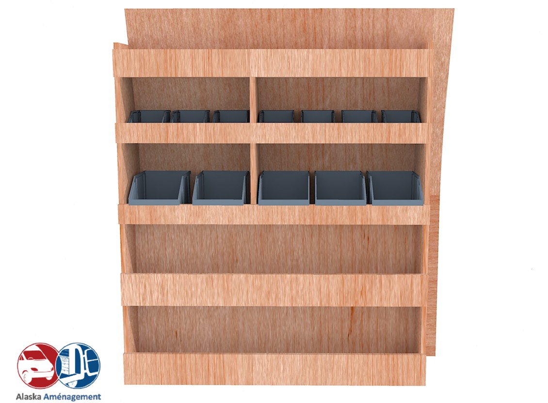 Ce meuble de rangement KRD101-N (pour le latéral « Droite » de votre véhicule) offre une solution de stockage polyvalente et fonctionnelle avec cinq niveaux de stockage. Il comprend des étagères pour bacs à bec pour ranger toutes vos petites pièces. Une étagère supérieure est conçue pour les objets longs. Son fond arrière intégré assure la rigidité et protège la carrosserie du véhicule, évitant un habillage supplémentaire. Le meuble est disponible en contreplaqué brut ou filmé.