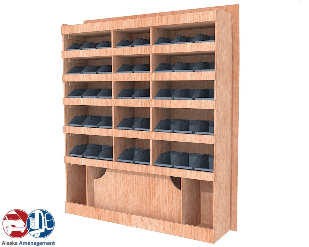 Ce meuble de rangement KRD101-N (pour le latéral « Droite » de votre véhicule) offre une solution de stockage polyvalente et fonctionnelle avec sept niveaux de stockage. Il comprend des étagères pour bacs à bec pour ranger toutes vos petites pièces. Une étagère supérieure est conçue pour les objets longs. Son fond arrière intégré assure la rigidité et protège la carrosserie du véhicule, évitant un habillage supplémentaire. Le meuble est disponible en contreplaqué brut ou filmé.