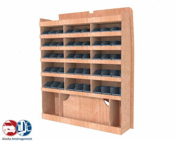 Ce meuble de rangement KRD101-N(pour le latéral « Droite » de votre véhicule) offre une solution de stockage polyvalente et fonctionnelle avec sept niveaux de stockage. Il comprend des étagères pour bacs à bec pour ranger toutes vos petites pièces. Une étagère supérieure est conçue pour les objets longs. Son fond arrière intégré assure la rigidité et protège la carrosserie du véhicule, évitant un habillage supplémentaire. Le meuble est disponible en contreplaqué brut ou filmé.