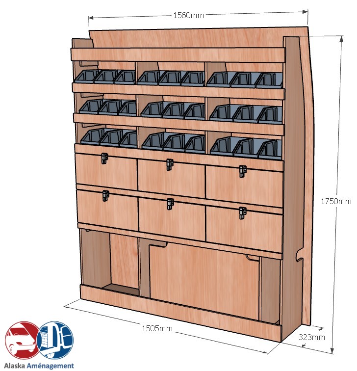Ce meuble de rangement KRD102-N (pour le latéral « Droite » de votre véhicule) offre une solution de stockage polyvalente et fonctionnelle avec sept niveaux de stockage. Il comprend des étagères pour bacs à bec et des clapets basculants. Une étagère supérieure est conçue pour les objets longs. Son fond arrière intégré assure la rigidité et protège la carrosserie du véhicule, évitant un habillage supplémentaire. Le meuble est disponible en contreplaqué brut ou filmé. |