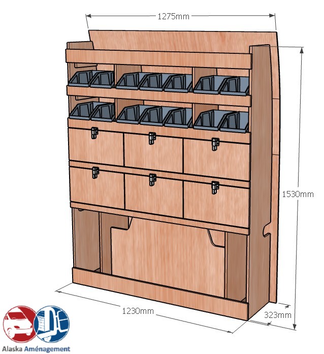 Ce meuble de rangement KRD102-N (pour le latéral « Droite » de votre véhicule) offre une solution de stockage polyvalente et fonctionnelle avec six niveaux de stockage. Il comprend des étagères pour bacs à bec et des clapets basculants. Une étagère supérieure est conçue pour les objets longs. Son fond arrière intégré assure la rigidité et protège la carrosserie du véhicule, évitant un habillage supplémentaire. Le meuble est disponible en contreplaqué brut ou filmé.