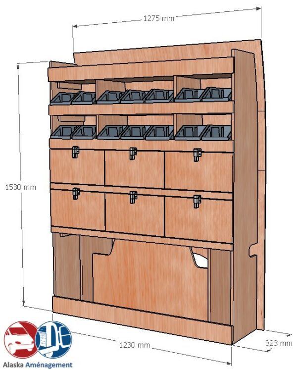 Ce meuble de rangement KRD102-N(pour le latéral « Droite » de votre véhicule) offre une solution de stockage polyvalente et fonctionnelle avec six niveaux de stockage. Il comprend des étagères pour bacs à bec et des clapets basculants. Une étagère supérieure est conçue pour les objets longs. Son fond arrière intégré assure la rigidité et protège la carrosserie du véhicule, évitant un habillage supplémentaire. Le meuble est disponible en contreplaqué brut ou filmé.