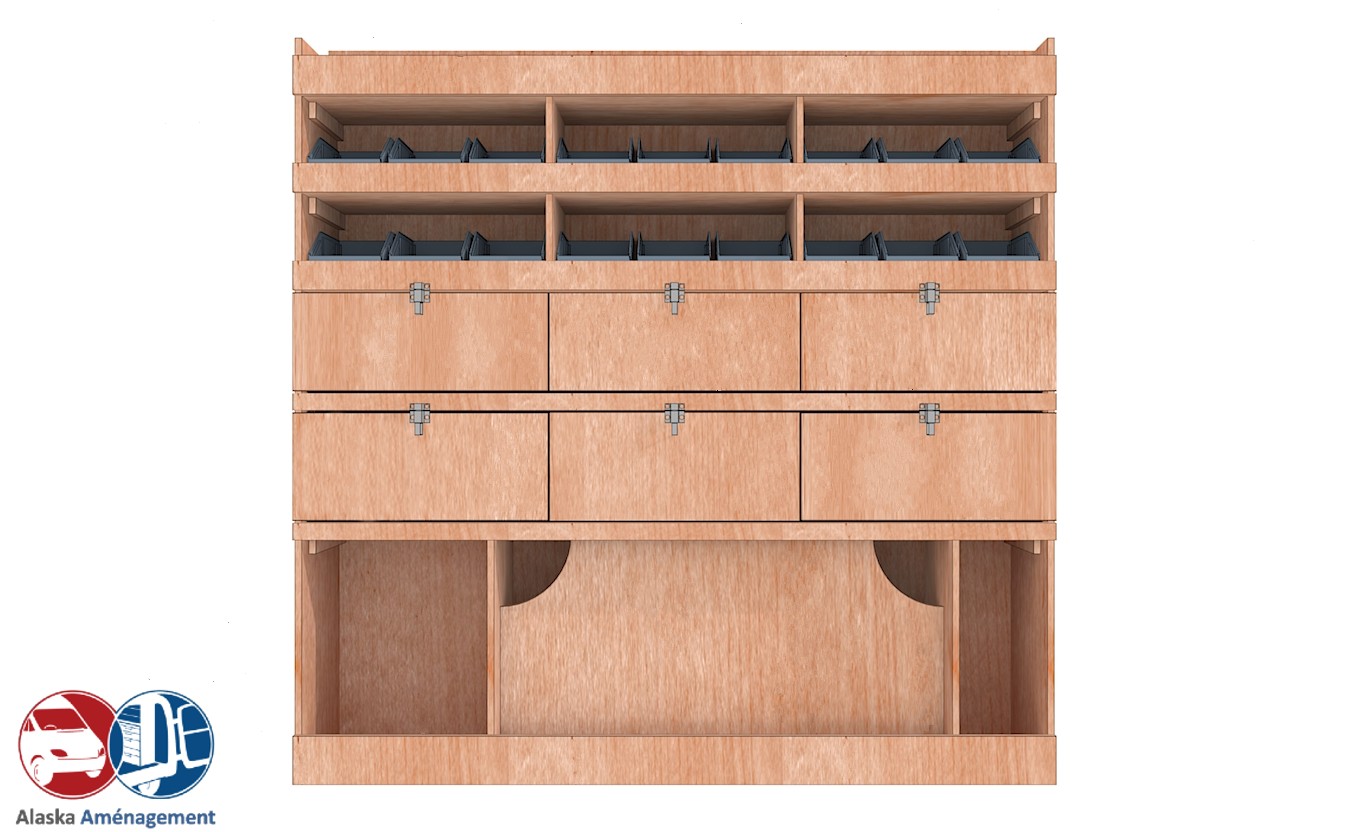 Ce meuble de rangement KRD102-N (pour le latéral « Droite » de votre véhicule) offre une solution de stockage polyvalente et fonctionnelle avec six niveaux de stockage. Il comprend des étagères pour bacs à bec et des clapets basculants. Une étagère supérieure est conçue pour les objets longs. Son fond arrière intégré assure la rigidité et protège la carrosserie du véhicule, évitant un habillage supplémentaire. Le meuble est disponible en contreplaqué brut ou filmé.