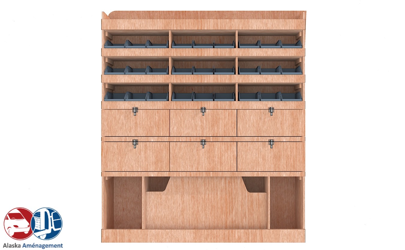 Ce meuble de rangement KRD102-N (pour le latéral « Droite » de votre véhicule) offre une solution de stockage polyvalente et fonctionnelle avec sept niveaux de stockage. Il comprend des étagères pour bacs à bec et des clapets basculants. Une étagère supérieure est conçue pour les objets longs. Son fond arrière intégré assure la rigidité et protège la carrosserie du véhicule, évitant un habillage supplémentaire. Le meuble est disponible en contreplaqué brut ou filmé. |
