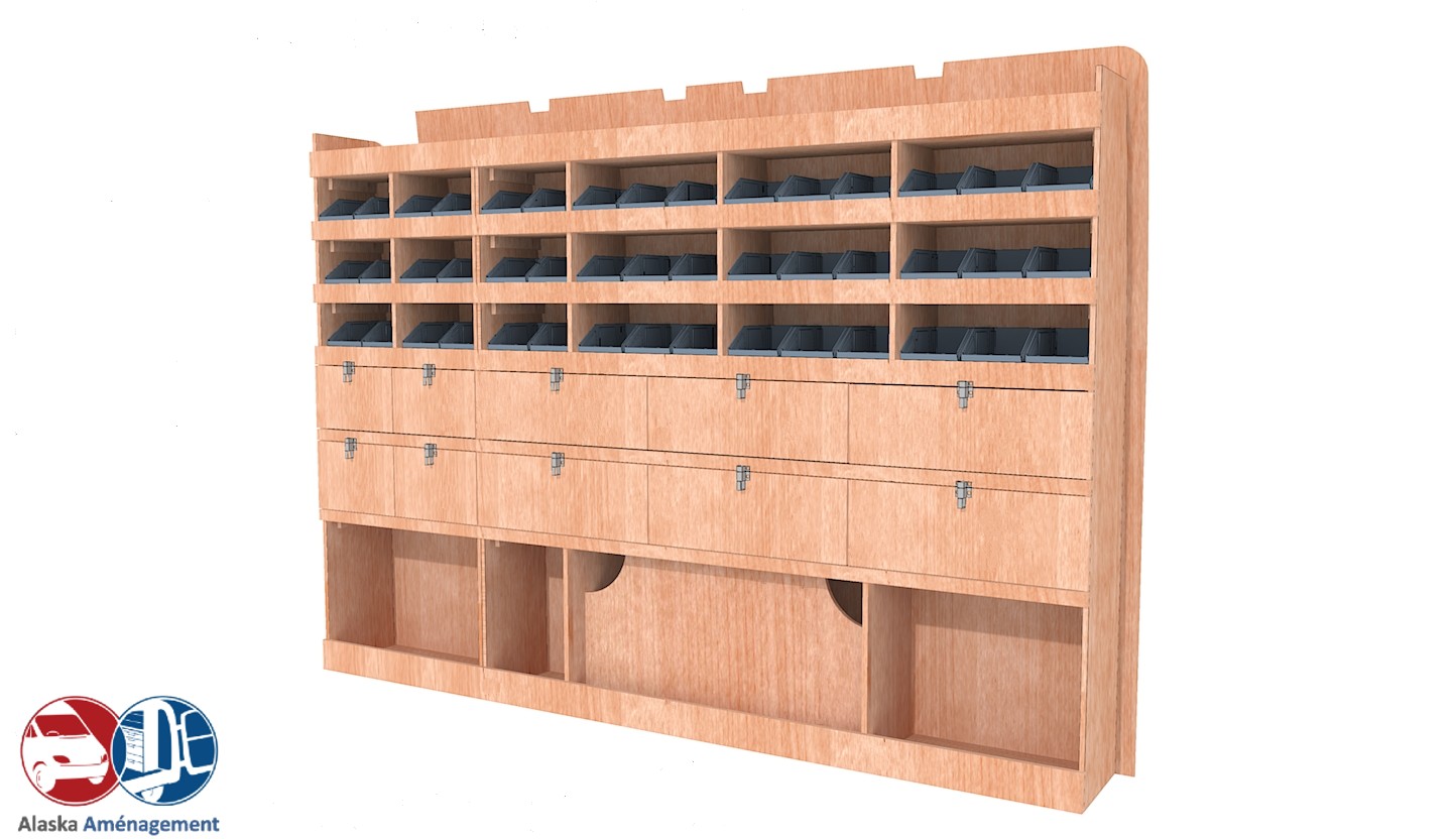 Ce meuble de rangement KRD102-N (pour le latéral « Droite » de votre véhicule) offre une solution de stockage polyvalente et fonctionnelle avec sept niveaux de stockage. Il comprend des étagères pour bacs à bec et des clapets basculants. Une étagère supérieure est conçue pour les objets longs. Son fond arrière intégré assure la rigidité et protège la carrosserie du véhicule, évitant un habillage supplémentaire. Le meuble est disponible en contreplaqué brut ou filmé.